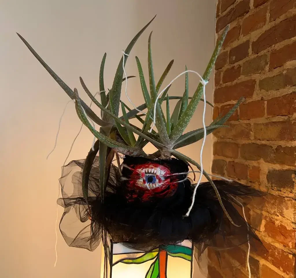 Vertical succulent walls aren’t just for nature lovers — they can become mini witchy landscapes with the right gothic-inspired decorations.