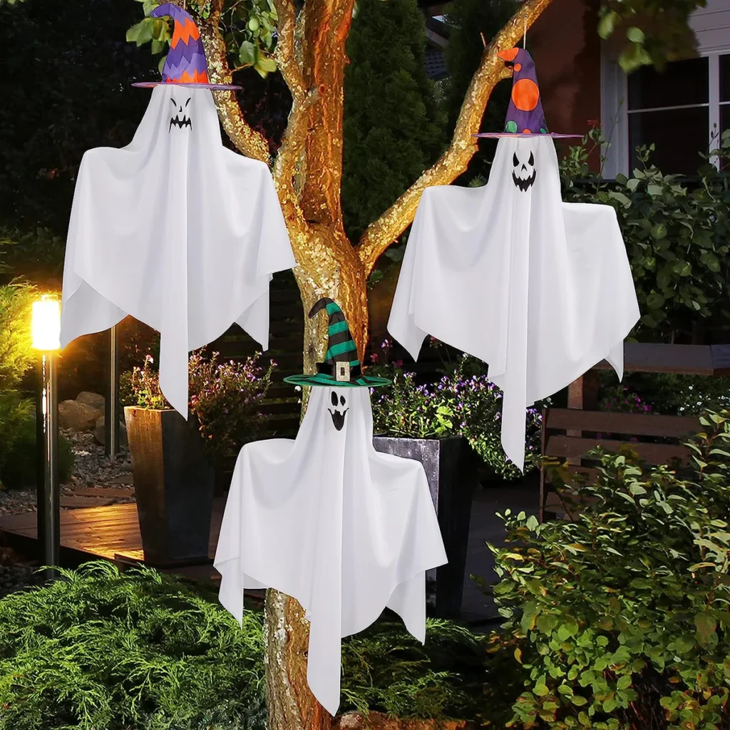 Floating ghosts are a classic Halloween element that can be adapted for a garden setting with surprisingly simple materials.