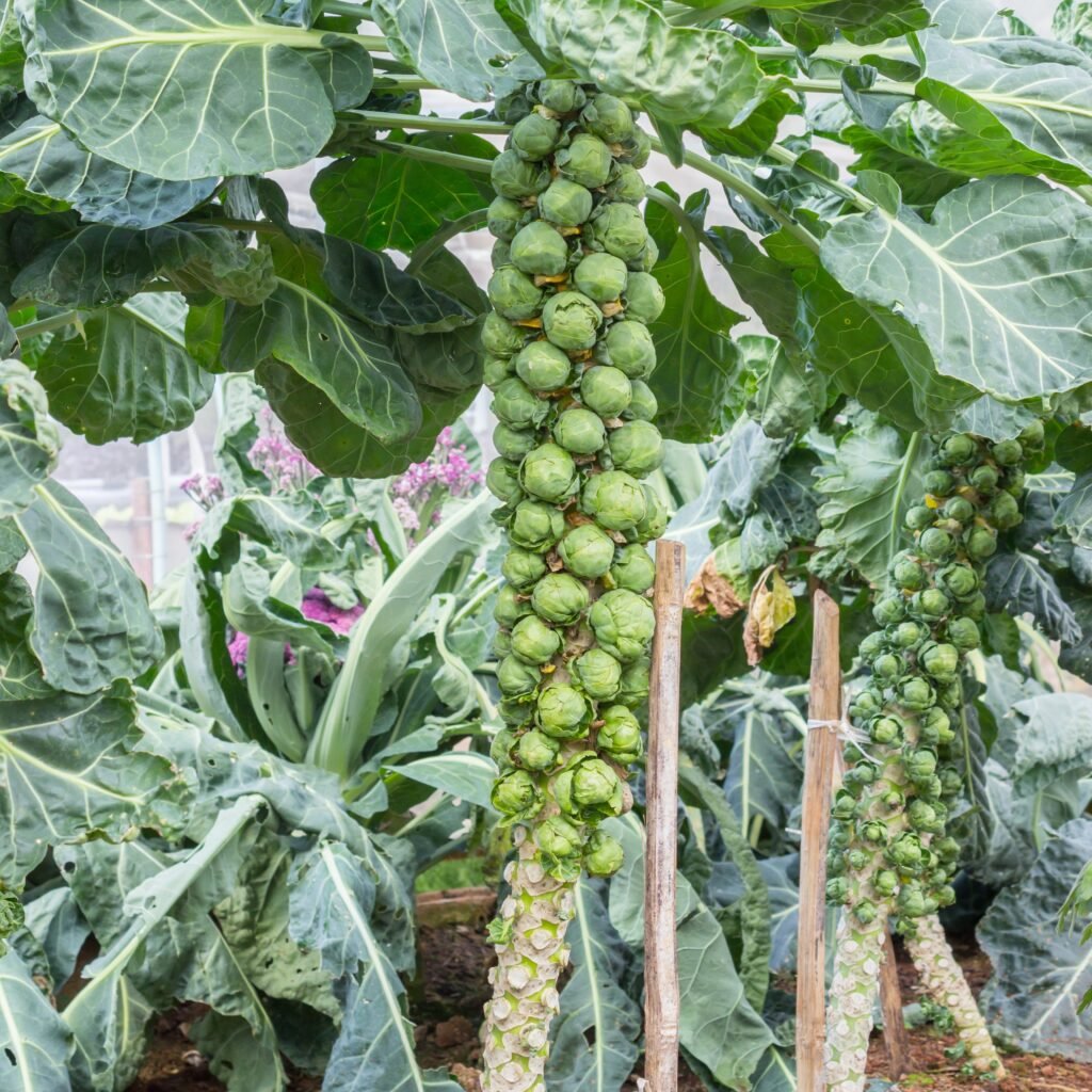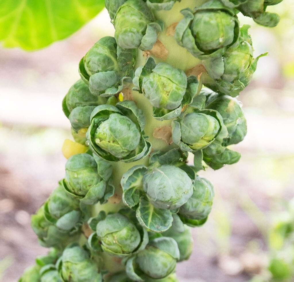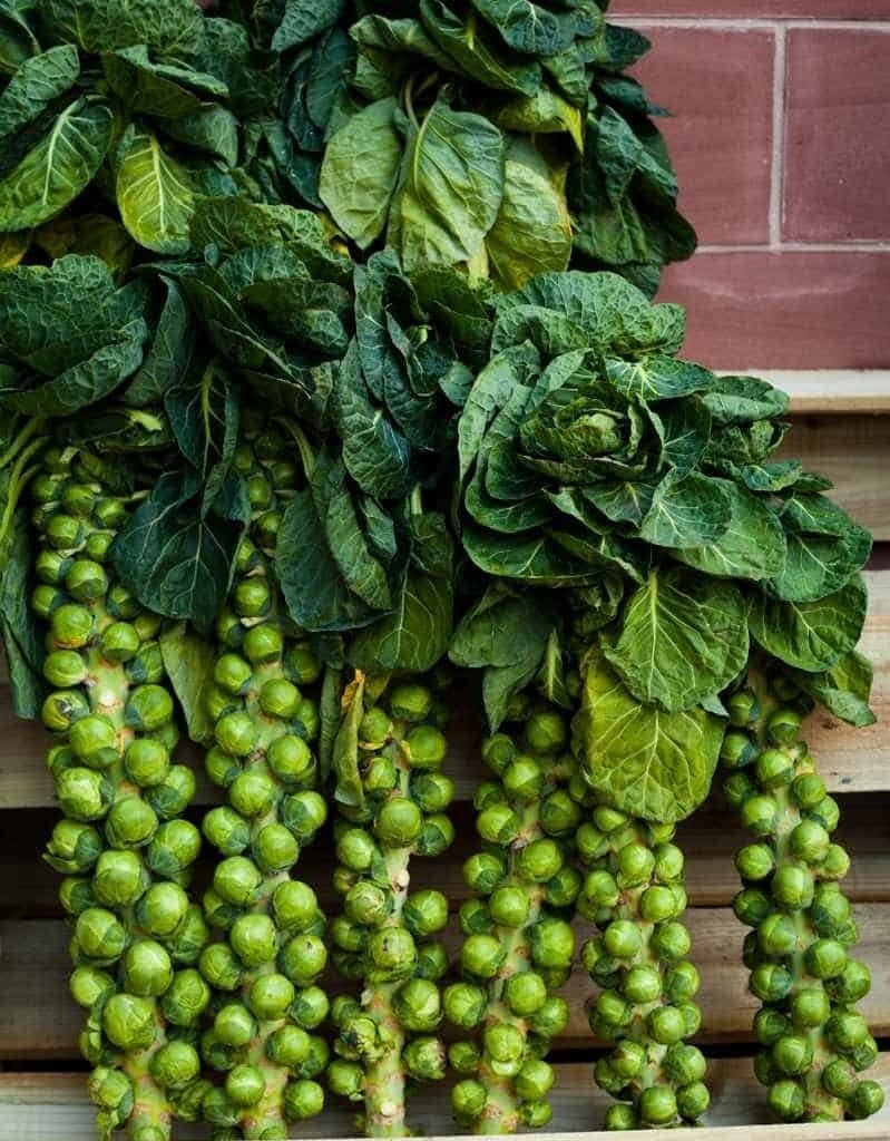 Brussels sprouts (Brassica oleracea var. gemmifera) belong to the cruciferous vegetable family, which also includes broccoli, cauliflower, kale, and cabbage. They grow on thick stalks, with miniature cabbage-like buds that form along the stem.