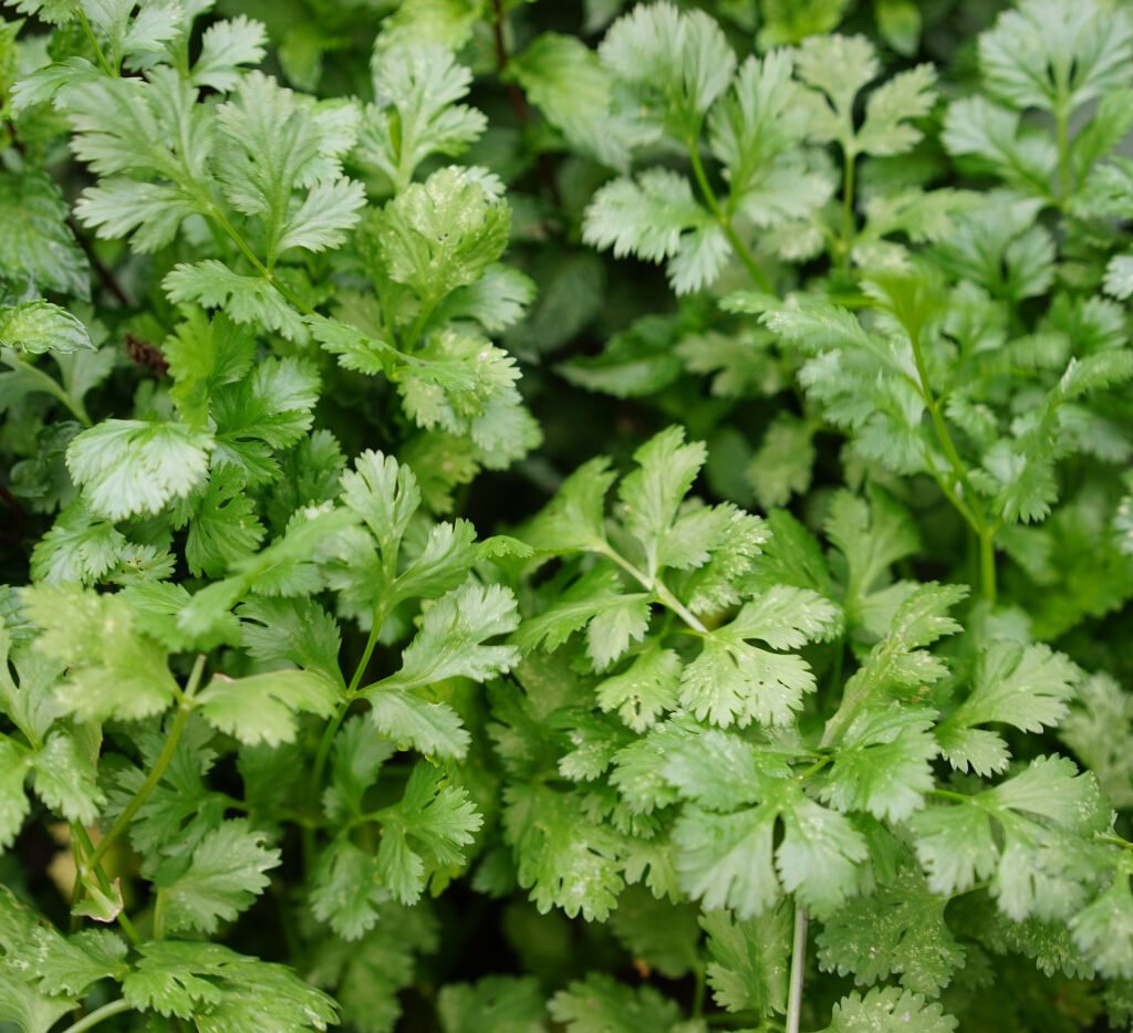 Cilantro grows well alongside tomatoes, peppers, onions, and spinach, helping to repel pests like aphids and spider mites naturally.